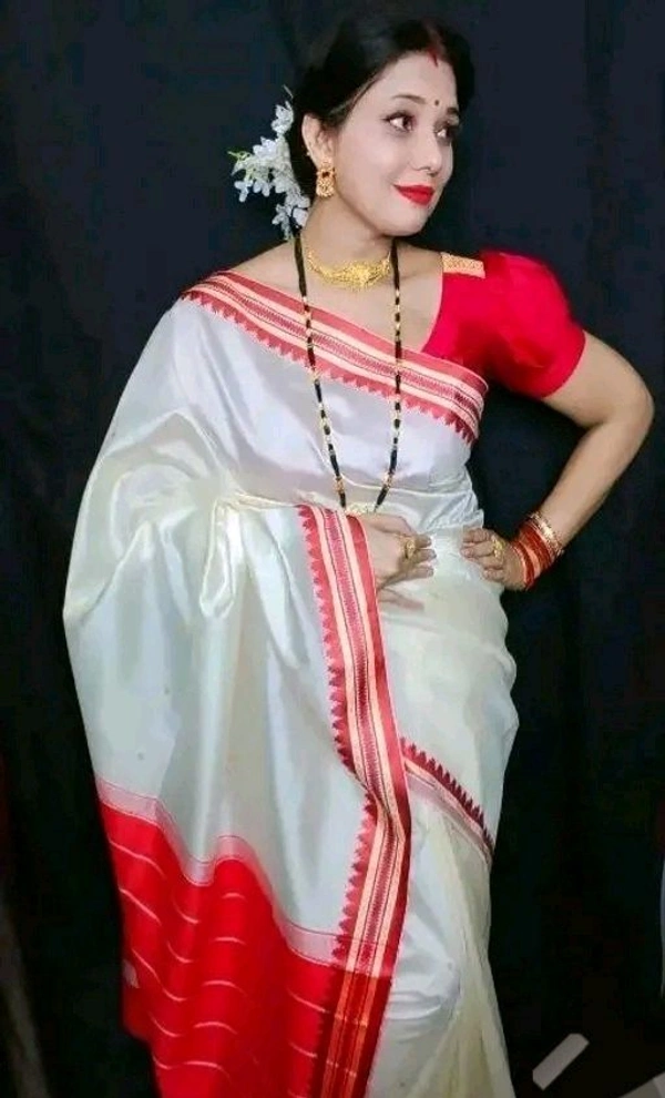 Tradational Red and White Kanjivaram Silk Saree for Bengali Garad Puja/ Wedding/ Durga Pooja with Running blouse