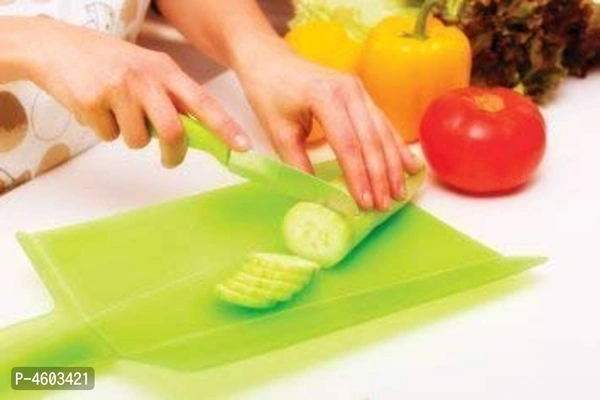 Brand Provide the folding cutting board and then fold it to guide the food neatly into the bowl or pan without any spills. The Slap Chop cutting board helps make food preparation a little less messy with its unique folding design. While it lies flat on a kitchen counter, it can be used as a normal cutting surface. After finish chopping, they can fold both ends of the cutting board upward to neatly guide the ingredients into a bowl, pan, or container, thereby eliminating splatter. Product Feature Tri Fold Cutting Board make it easy to chop and scoop food from cutting board to pots, pans, and bowls. Convenient handle to hold and squeeze board to make it fold into a funnel like shape to pour cut food into cooking container. Made of durable BPA free plastic material. Colors are assorted Easy to Clean, Dishwasher Safe. Enjoy cutting chopping food and scooping food from this versatile folding cutting board directly into cooking pots and pans -With convenient handle and unique tri fold action