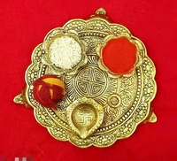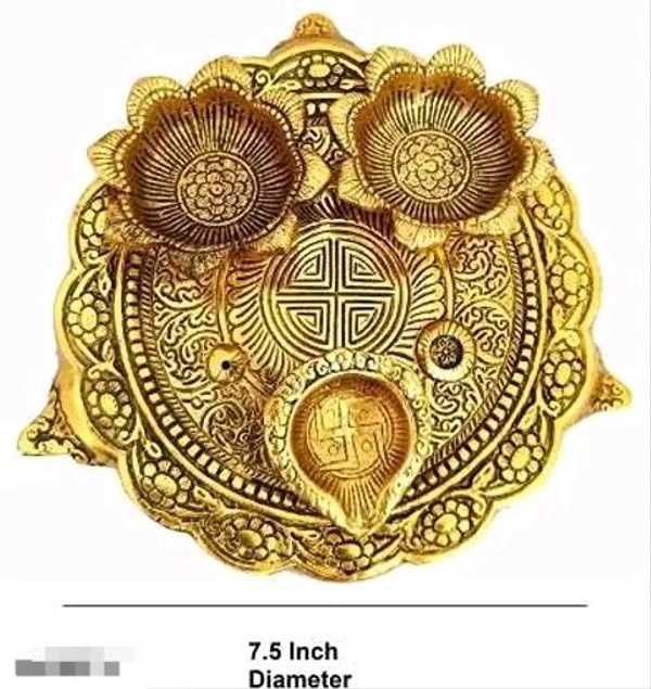 Golden Pooja Thali With 3 Diyas For Home Temple Office
