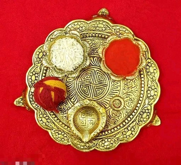 The Pooja Thali has 2 vatis for keeping kumkum, haldi, rice or lighting diya.