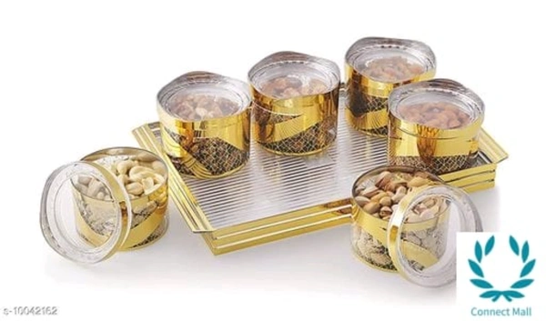 Liza Lagoona 6 Pieces Jar Set With Tray - 250 ml, , GoldMaterial: PlasticPack: Pack of 1Product Length: 40 cmProduct Breadth: 25 cmProduct Height: 9.5 cmCountry of Origin: India
