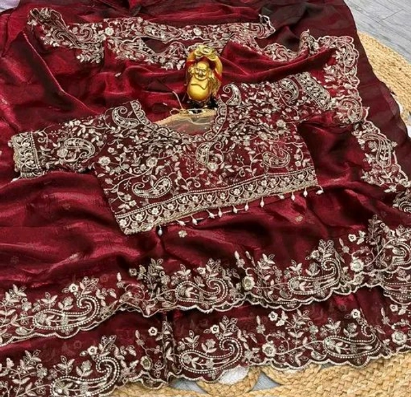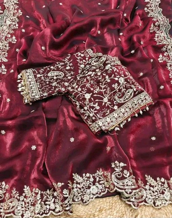 Most Beautyful Soft Satain Elegant Embroidery Saree 3mm sequence heavyBorder with Stitched Blouse - clour