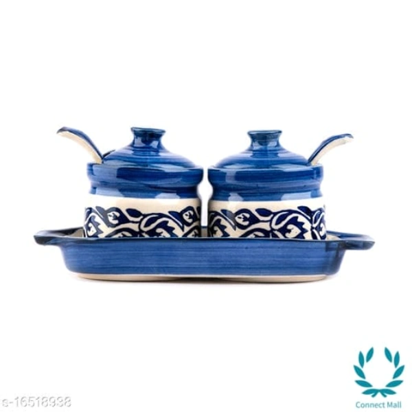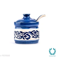 The Earth Store Ceramic Mughal Blue Handcrafted Multipurpose Achar Pickle Jar/Barni with Lid and Spoon for Pickle Spice Jar, Pepper, Kitchen Spice, Sugar Home Crockery/Storage Container (Set of 2)
